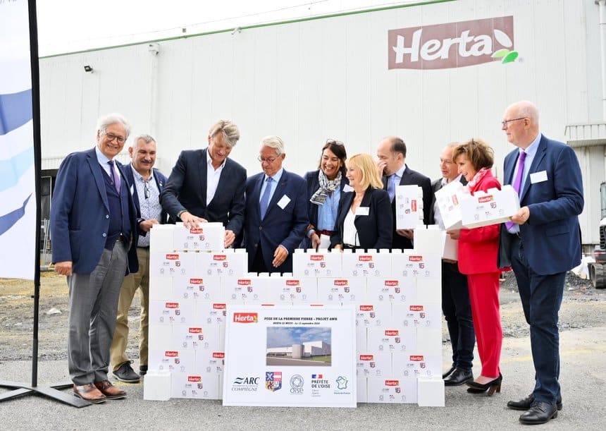 Vendredi dernier, Herta a officialisé l’extension de sa plateforme logistique de Le Meux, près de Compiègne, en posant la première pierre d’un bâtiment destiné à héberger un transstockeur qui opérera en frais (0-4°C)