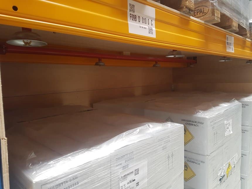 Informé que les conditions de stockage de ces articles allaient se durcir, il a mis au point, avec Jungheinrich et Minimax (expert en protection incendie) un système de caisson en bois où une palette est surmontée de 4 têtes de Sprinkler, soit 2.800 têtes pour une seule cellule. « Cela n’existait pas, souligne Alban Boidron. Le but est de confiner la chaleur dans le caisson, et de noyer un départ de feu sous une grande quantité d’eau afin de contenir les émanations toxiques, mais sans mettre trop d’eau ailleurs car ces marchandises réagissent mal à l’eau