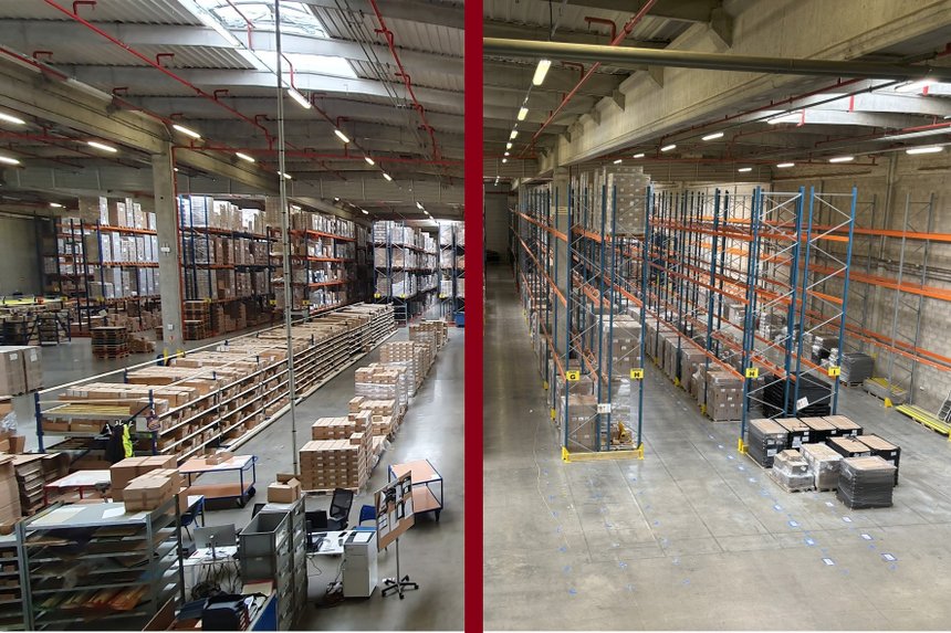 Avant / après : la zone de picking dédiée, très dense, a laissé place à des racks avec picking sous palettiers (au niveau zéro) dans l’entrepôt Palais des Thés de Bussy-Saint-Georges. © Palais des Thés