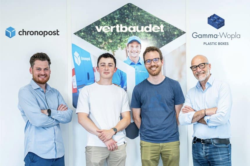 Au centre Guillaume David, responsable Projet & Amélioration Continue et Antoine Millamon, Responsable Flux & Transport chez Vertbaudet, entourés (à g.) par Valentin Huart, responsable Grand Compte National chez Chronopost et (à d.) par Didier Maréchal, Responsable Retail France de Gamma-Wopla. © Gamma-Wopla