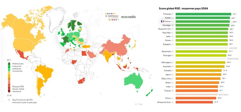 Les entreprises françaises de classent dans le trio de tête mondial de la moyenne du score des évaluations EcoVadis.© Ecovadis / le Médiateur des Entreprises