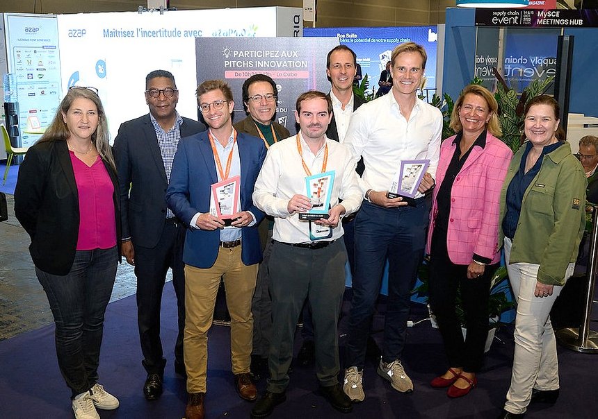 Les lauréats des Digital Supply Chain Awards entourés des membres du Jury : de gauche à droite, trophées en main, les fondateurs et dirigeants d’Oplit, Zensimu et Urbantz : Thibaut Wilhelm, Mathias Le Scaon et Michael Darchambeau. ©Supply Chain Event