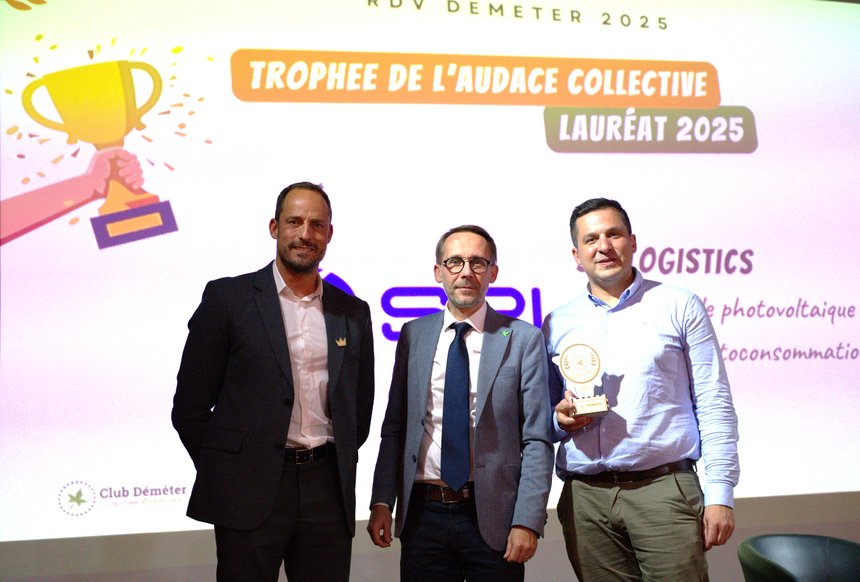 Au centre Gregory Debuchy, le président de Club Déméter Logistique Responsable entouré de Victor-Emmanuel Vieilly et Nicolas Satin, respectivement CEO et responsable RSE de SPI Group. ©Club Demeter.