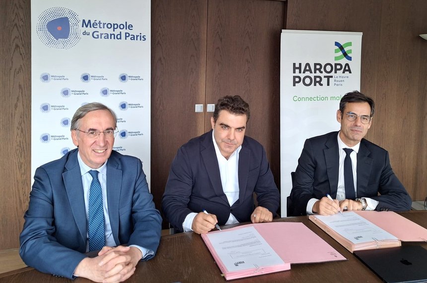 En signature jeudi dernier, de G à D : Jean-Michel Genestier, vice-président du Grand-Paris, conseiller délégué à la logistique métropolitaine et maire du Raincy ; Thomas Castan, président-fondateur d’ULS ; et Antoine Berbain, directeur général délégué d’Haropa Port. ©Haropa Port