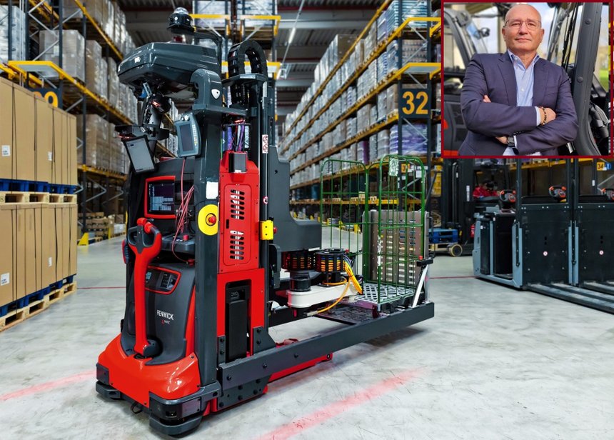 Selon Jacques Arrighi, le directeur général de l’entreprise (photo en médaillon), RoCaP, le nouveau chariot automatisé avec bras multiaxes intégré de Fenwick-Linde, sera commercialisé dès l’an prochain en France. ©Fenwick-Linde