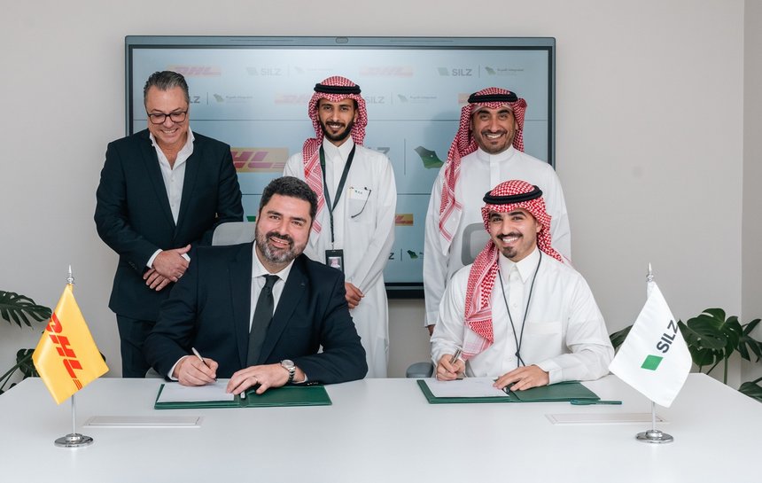 Signature du bail entre DHL SC et SILZ, avec au premier rang, Mostapha Mokdad, directeur général de DHL Supply Chain Arabie Saoudite, et Khalid Alotaishan, directeur commercial de SILZ. ©DHL Group